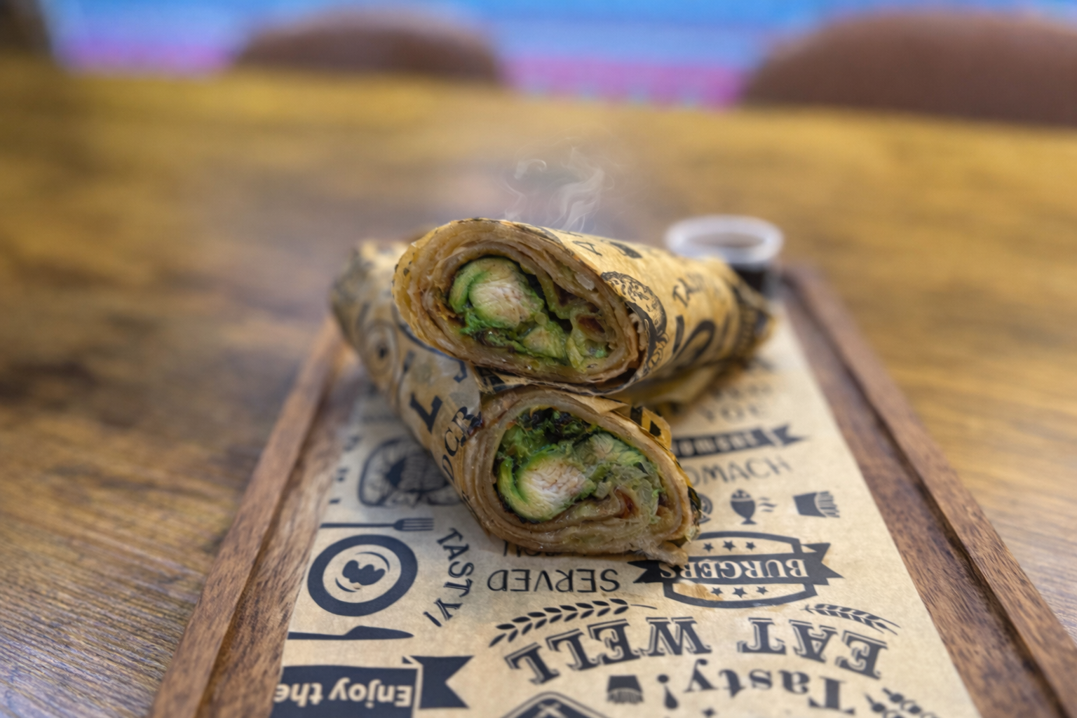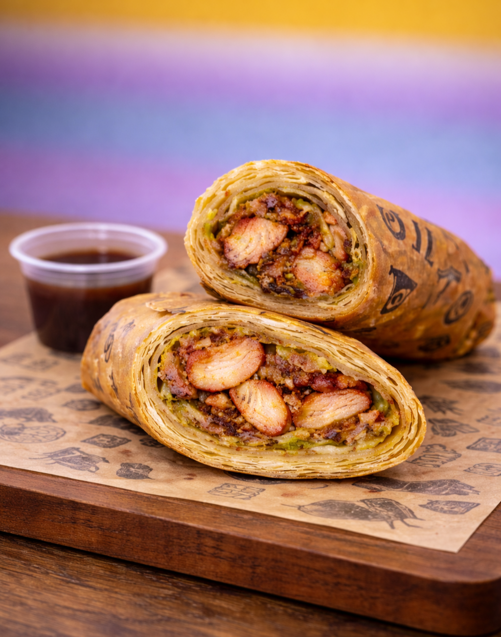 Thinly sliced, spice-marinated beef grilled until smoky and tender, wrapped in buttery layered flatbread with fresh onions and house sauces. Think steak wrap — with serious flavor.
