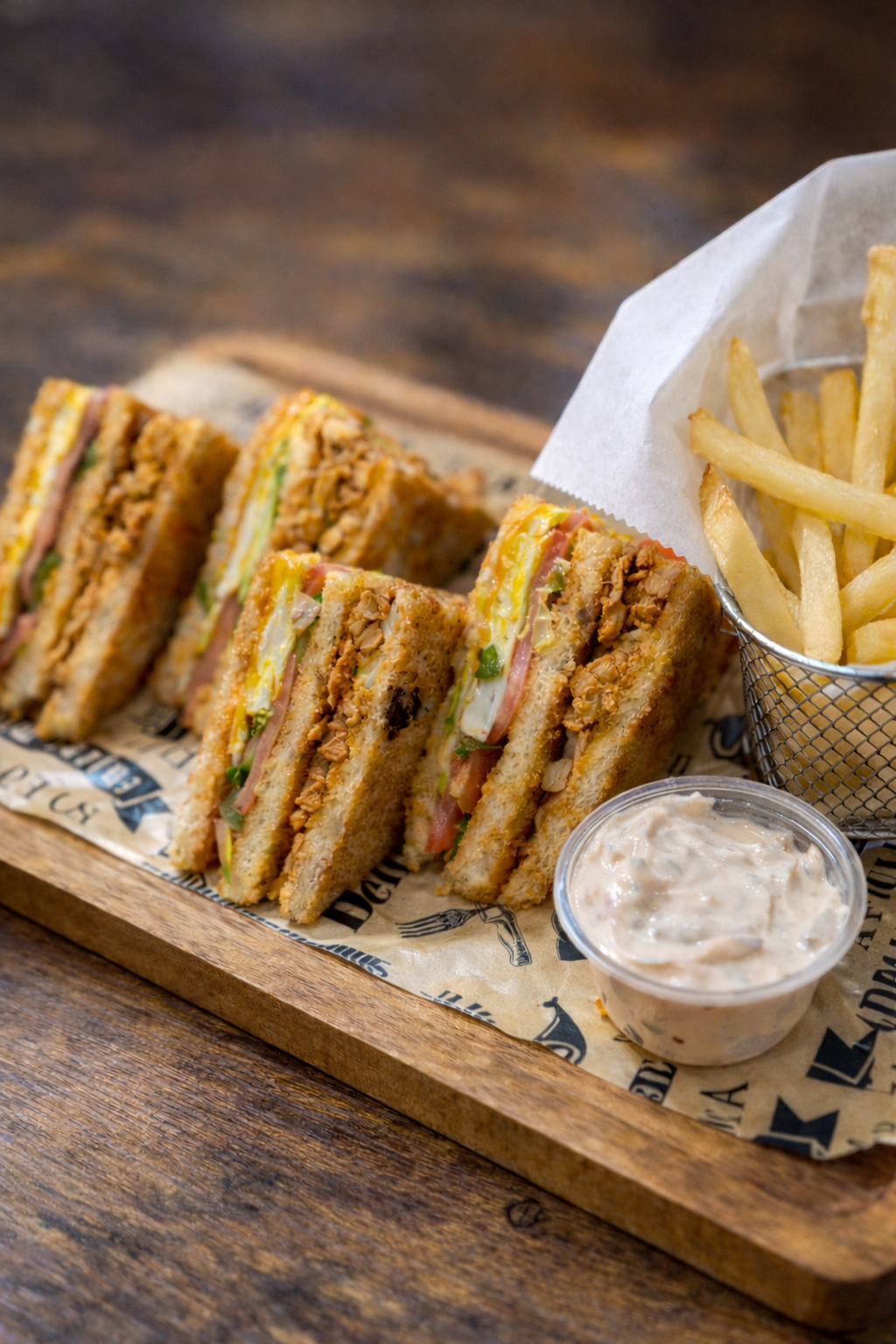 Three layers of toasted bread loaded with chopped chicken steak, melted cheese, fried eggs, crisp cucumbers, tomatoes, pickled jalapeños, and our signature sauce. Stacked high, saucy, and seriously satisfying — served with fries and coleslaw.